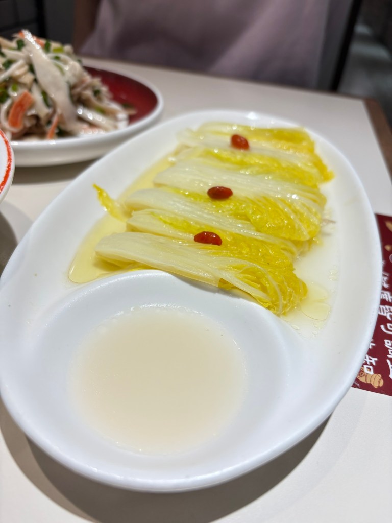 我們另外點了兩份小菜,一份是娃娃菜,另一份是小黃瓜。娃娃菜已經煮到軟,湯頭很鮮甜。小黃瓜非常的清脆,配上他們調的辣味醬汁,超級好吃!推薦可以點這兩樣小菜。