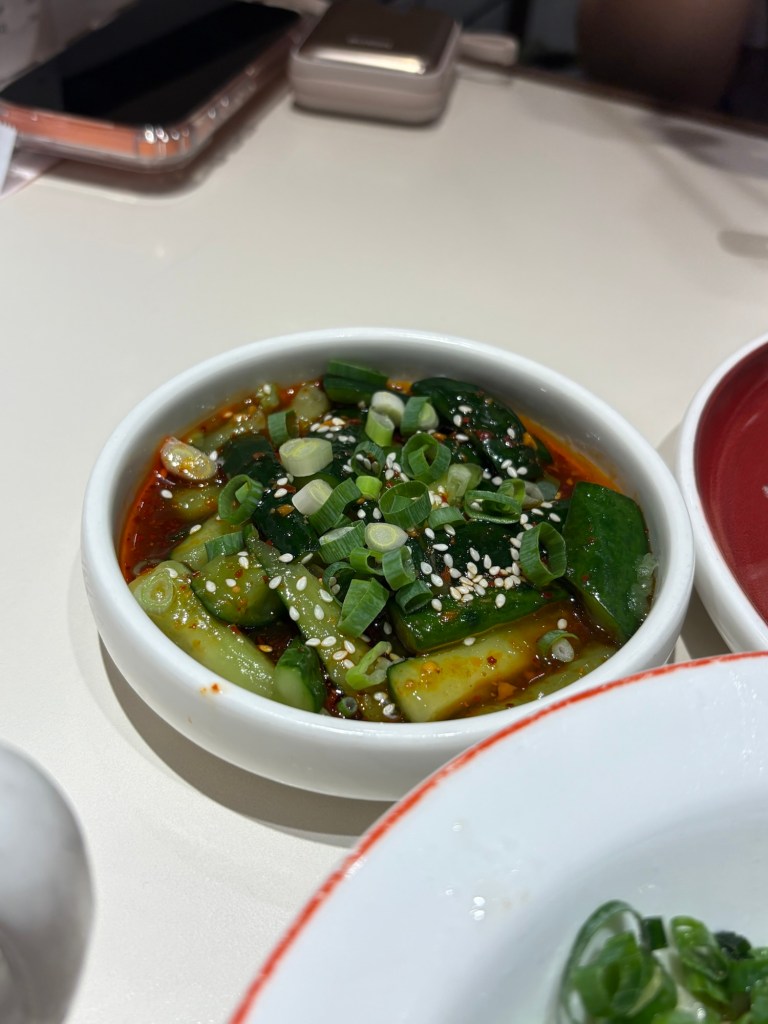 We also ordered two side dishes: mini cabbage and cucumber. The mini cabbage was cooked until soft; it is very sweet and flavorful. The cucumber was very crisp, and paired with their spicy sauce, it was absolutely delicious! I highly recommend ordering these two side dishes.
