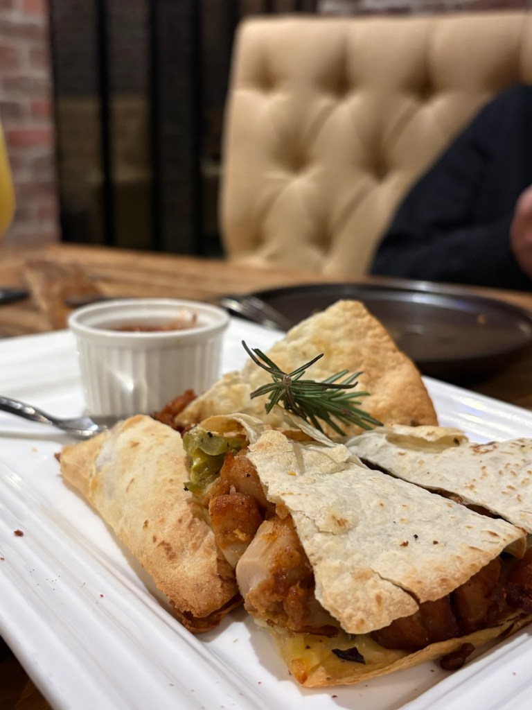 墨西哥雞肉餅也是我每次來金色三麥都會點的餐點,因為它的酥炸雞肉調丁過味,雞肉外皮稍硬,但是配上薄餅跟莎莎醬實在是絕配,這個辣度配上一口雞肉餅加上莎莎醬的酸甜味,真的非常好吃,一吃上癮!