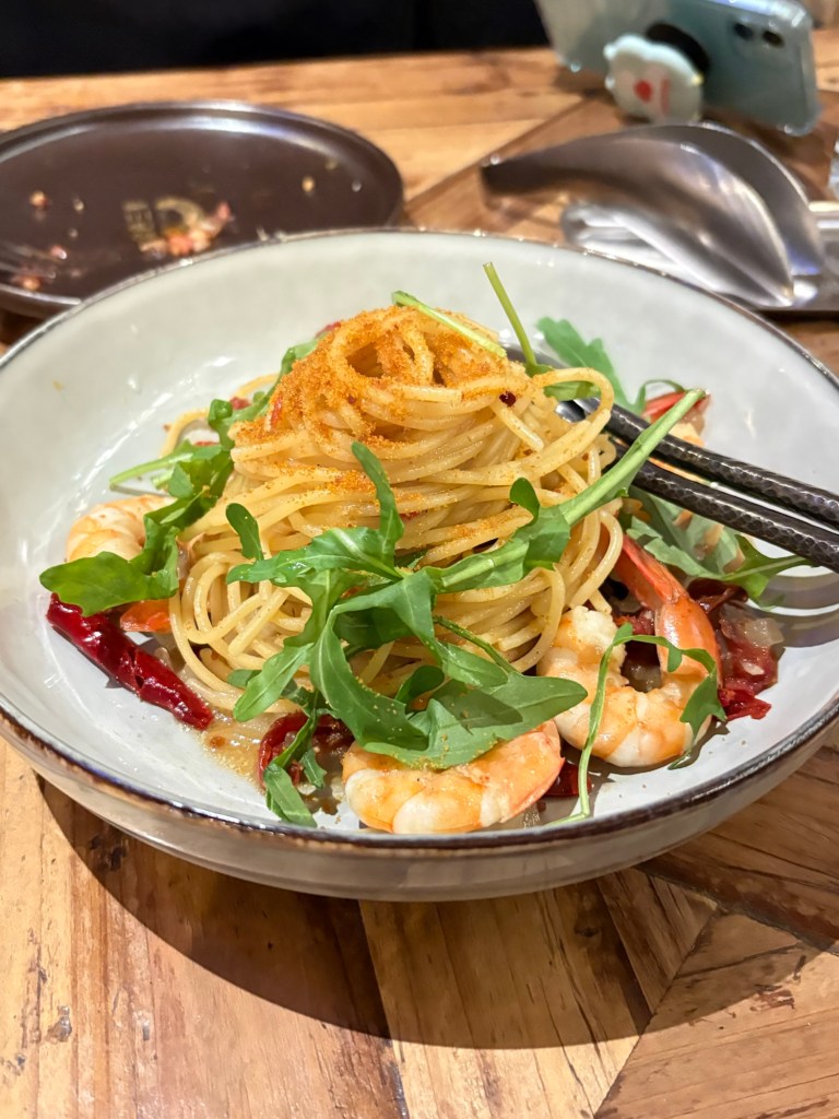 This pasta has a rich Sicilian anchovy flavor, and it also contains local Taiwanese mullet roe, dried tomatoes, and dried chili peppers, creating a very complex and flavorful dish. Even the shrimp are pre-peeled for you! This is definitely a delicious Taiwanese-style pasta dish.