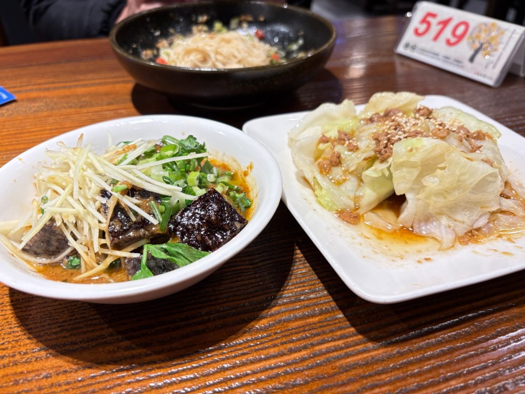 We also ordered some side dishes, including rice blood cake and tea-smoked cabbage. These are our usual dishes. The rice blood cake was soft and tender, paired with a special sauce and a touch of ginger for a pungent flavor—it was delicious. The cabbage really did have a tea-smoked flavor, making it perfect for stir-frying, unlike the cabbage served in typical stir-fry restaurants.